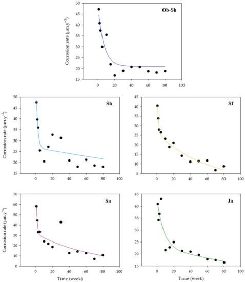 The degree of corrosion damage was expressed in terms of the instantaneous corrosion rate (CR) in µm·y−1 denotes CSX36 corrosion in the Jeddah soil solution for different periods. Figure 4 shows the approximate fitting curves between the instantaneous CR and immersion time over 80 weeks. Higher CRs were observed in the first few weeks than in later weeks. This finding was observed because the surface of the metal continuously dissolved in the soil solutions. However, the early corrosion products provided a protective effect in suppressing the corrosion process formed on the surface. Thus, the CR slowed gradually with the formation of a rust layer [25].