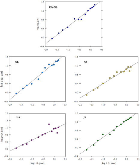 Figure 5 shows a log-log plot of the penetration depth ( ρ , µm) and the time of exposure (t, years) using the following equation [26]: