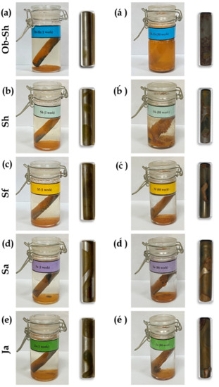 The images of the CSX36 specimens inside the tested bottle solutions after they were removed at two immersion periods (1 and 80 weeks) are shown in Figure 6. The figure shows that the soil solutions containing the C-steel specimens were observable with apparent solution clarity in the initial immersion stage of the soil solutions. The formation of dense corrosion products on the sample was observed during a prolonged immersion period (Figure 6á–é. Unfortunately, for some soil solutions, the corrosion product diffused from the sample surface into the solution, resulting in turbid solutions. In some cases, the intensity of the turbidity was such that the steel sample could no longer be identified (Figure 6á).
