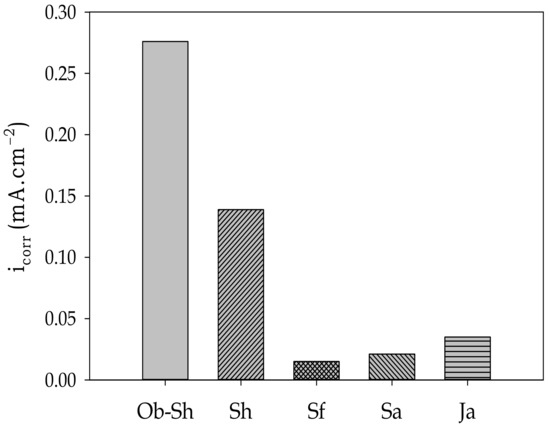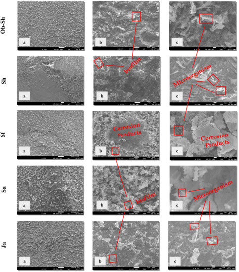 In the case of the Ob-Sh, Sh, and Ja soil solutions, uneven corrosion products accompanied by scattered biofilm were observed. Hence, they provide poor protection for metals [28]. This result agrees with the high CRs detected for these soil solutions (Table 3). For the Sf and Sa soil solutions, the biofilm overlapped with the corrosion products, forming a protective layer on the metal surface. Diffusion through the pores of this layer may control the CR, as previously discussed.