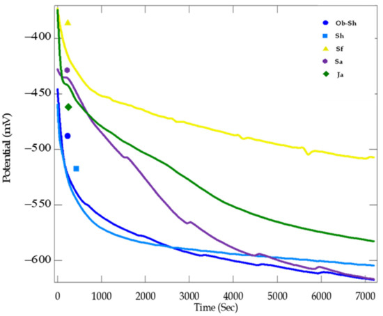 As shown in Figure 8, after the initial stabilization period of the CSX36 electrode in the soil solutions, the OCP values ranged from −502 to −613 mV, which is the range of carbon steel, depending on the composition of the steel, the activity of all soil solutions, and the corrosive environment [32,33]. It is noted that the OCP of CSX36 in the soil solution of both Ob-Sh and Sh drops rapidly in the negative direction and reaches stability in less time compared to the other soils‚ which indicates a higher corrosion rate and may be attributed to a high salt content‚ especially chloride ions [34], as shown in Table 2.