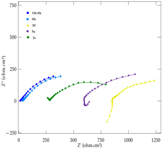 Figure 9. Nyquist plots for the corrosion of CSX36 specimen in the studied Jeddah soil solutions at 30 ± 1 °C.