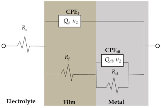 The interpretation of EIS data depends mainly on the development of equivalent circuits for modeling the metal–electrolyte interface. Various equivalent circuits were applied to simulate the experimental EIS diagrams using the software program ZSimDemo 3.20. After various attempts to simulate the EIS data, an equivalent circuit well fit to describe the corrosion processes at the metal–electrolyte interface was finally obtained (Figure 10). Several authors have reported similar equivalent circuits for corroded steel in different soils [38,39,40].