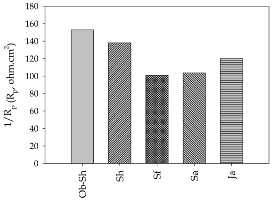 Figure 12. Variation in 1/Rp for the studied Jeddah soil solutions.