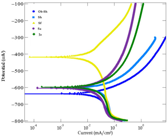 Figure 13. PDP curves for the corrosion of CSX36 specimen corrosion in the studied Jeddah soil solutions at 30 ± 1 °C.