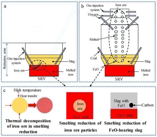 Different bath smelting models. (a) Injected into the melt; (b) ore melts and drops into slag; (c) key aspects in smelting reduction.