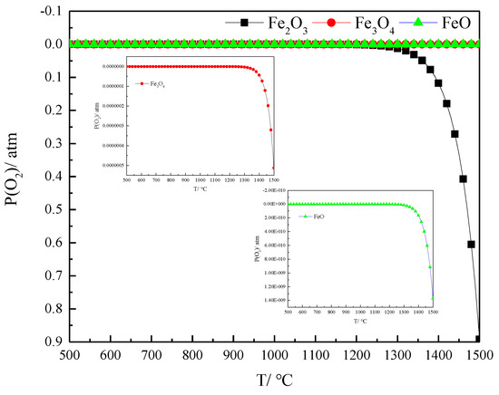 The results of partial oxygen pressure for the decomposition of iron oxides (Fe2O3, Fe3O4 and FeO) at different temperatures were calculated with FactSage, as shown in Figure 3. Partial oxygen pressure during the decomposition of Fe2O3 at 500 and 1000 °C was 9.4505 × 10−20 and 1.7968 × 10−6 atm, respectively. The partial oxygen pressure of hematite’s thermal decomposition at 1400 and 1500 °C was 0.1175 and 0.8919 atm, respectively. The partial oxygen decomposition pressure of Fe3O4 500 and at 1500 °C was 5.2033 × 10−30 and 5.1294 × 10−7 atm, respectively. The partial oxygen decomposition pressure of FeO at 1500 °C was 1.3700 × 10−9 atm. Hematite is more difficult to decompose into magnetite at low temperatures, and easier to decompose at high temperatures to produce magnetite. The decomposition reaction of Fe3O4 and FeO at normal pressure levels does not occur below 1500 °C.