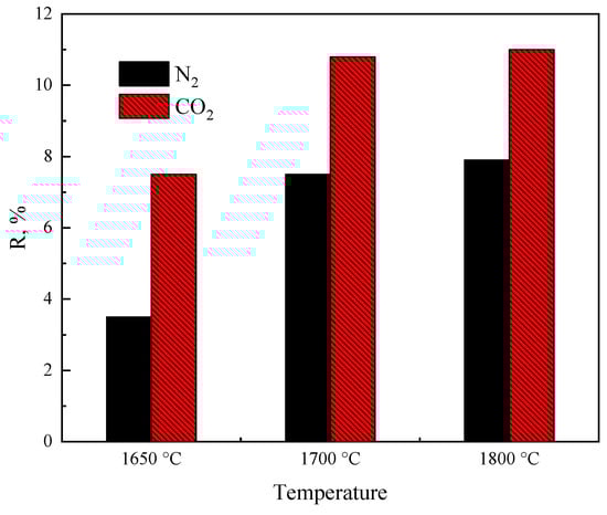 The R of hematite in CO2 atmosphere was 3–4% higher than that in the N2 atmosphere, as shown in Figure 4. This is mainly related to the structure of the gas molecules, as CO2 has a higher thermal radiation capacity than that of N2, as the particles heat up faster through radiation in a CO2 atmosphere than they do in an N2 or Ar atmosphere [25].