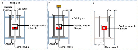 The gas testing method (as shown in Figure 5a) focuses on the characterization of the reduction gas produced by the smelting reduction reaction, as shown in Equation (6). The method can be used to calculate reduction rates using the CO gas flow generated during experiments [44], and reaction rates using a pressure detector to determine changes in pressure within the sealed system [45].