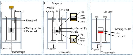 The method shown in Figure 8c can be used to conduct smelting reduction experiments between slag and Fe–C melts. The reaction rate of the experimental process is calculated from the chemical composition of the slag sample, the overall weight loss of the crucible, or via the reaction gases, as in the method shown in Figure 8b. These experimental methods could be observed by using X-ray fluoroscopy.