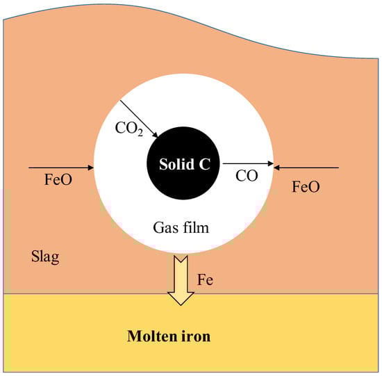 When molten iron oxide in slag is reduced by solid carbon, numerous previous studies have shown that the total reaction of FeO-bearing slag with solid carbon can be indicated with Equation (13), and the reaction process is shown in Figure 9.