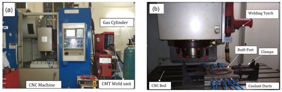 (a) Experimental setup showing the CNC machine and the weld-deposition unit; (b) Weld-deposition unit mounted on the CNC’s milling head.