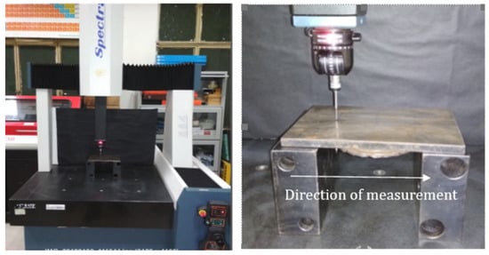 Once the deposition was complete, the components were allowed to cool down to room temperature and then unclamped. The significant and localized nature of the heat input during the deposition process resulted in the development of thermal stresses. When the substrate was released, some of the stresses resulted in the deformation of the substrate, while residual stresses remained. Hence, distortion and residual stresses were of interest as a measure of thermal stresses developed in the process. The distortion was measured by using a coordinate measuring machine (CMM). The baseplate was placed upside down over the parallel blocks, as shown in Figure 3. The reference plane and centre coordinates were chosen at the centre of the plate. These obtained coordinates were used for profiling the deformed substrate.