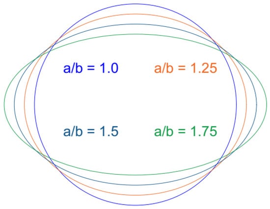 The role of the shape/geometry of the deposited component was captured in the form of symmetricity (or lack of it) by taking an elliptical shape and changing the major to minor radii (a/b) of the ellipse, as shown in Figure 6. This a/b ratio was altered in such a manner that the total perimeter of the ellipse remained constant. It may be noted that the size of the substrate plate might also affect the distortion. However, as the AM substrate is usually sacrificial, it was not considered in the current analysis.