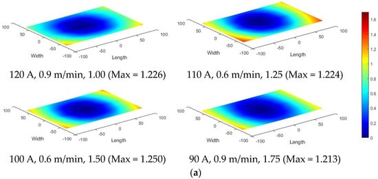 Aspect ratio vs. torch speed, fixed current: (Figure 8(a3,b3)): The behaviour, in this case, is very similar to that of the earlier in terms of the a/b ratio. As the torch speed increases, the heat distributes faster, decreasing the thermal gradients and the distortions. Hence, it can be observed that as the torch speed moves faster, the maximum distortion decreases.