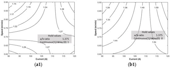 Based on the regression Equations (3) and (4), a contour plot for stress disparity is plotted and shown in Figure 11. It can be observed from Figure 11 that residual stress strongly depends on the a/b ratio and speed for forced and natural cooling (Figure 11(a1,b1), respectively). As the torch speed increases, the heat is distributed faster, decreasing the thermal gradients and the stresses. When the geometry is closer to a circular form, the thermal energy accumulates at the centre, leading to higher residual stresses. The stresses for a given set of speed and a/b ratio are more with forced cooling than natural cooling. The forced cooling traps the stresses, which is not the case with natural cooling.
