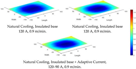 In the previous section on the passive approach, the operating conditions were disjointed from the process evolution. This section examines the feasibility and benefits of active thermal management. Active management was achieved by altering the starting conditions (through baseplate preheating) and the interlayer conditions (through an adaptive change in welding current). As the objective here was to speculate on the role of active management and parameter optimization per se, parameters were chosen so that the thermal gradients were manifested in a magnified manner. Hence, maximum current, maximum torch speed and continuous deposition were determined. The a/b ratio was kept at 1.0. To eliminate any possible interference from the operating environment and to focus solely on the thermal evolution inside the deposited system, the base was held on an asbestos sheet, insulated from the remaining system and allowed to cool down naturally. Three experiments were performed to demonstrate the active approach, namely A1—natural cooling with an insulated base, A2—natural cooling with an insulated and heated plate, and A3—natural cooling with an insulated base and adaptive change of current. The current was adapted between 90 to 120 A. The current was reduced in steps of 3 A per layer. The speed was also changed in the same proportion by keeping the current/speed ratio constant. The constant ratio ensured a constant heat input per unit length.