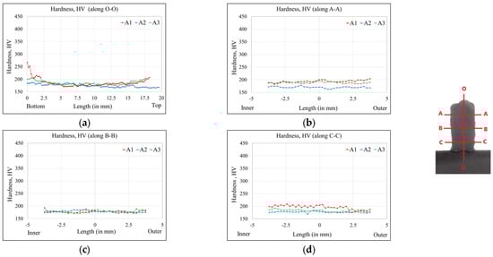 As additive manufacturing is a process in which the component is gradually fabricated, the deposition sequence is also a parameter to be factored in. To understand how the sequence of steps affects the properties of the fabricated component, the hardness variation across the cross-section for three samples (P1, P3, P16) from the above set, indicative of a different rate of cooling, was carried out. Hardness was measured across the height along the centerline (O−O) and three places (randomly at A−A, B−B, and C−C) across the width of the sample, as shown in Figure 12.