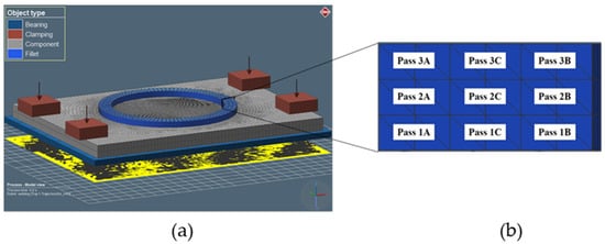Weld-deposition modelling in Simufact: (a) Overall setup, (b) sectional view of the deposition passes.