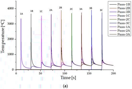 Temperature vs. time plot of weld passes A–C for (a) A, Insulated plate, (b) B, Insulated + heated substrate (400 °C); (c) C, Insulate base + adaptive current.