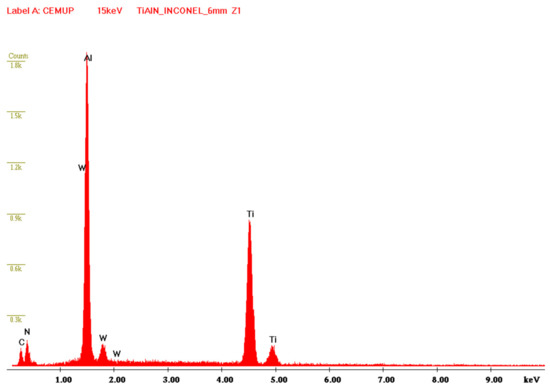 EDS analysis was performed to confirm the coating’s chemical composition in the area indicated in Figure 2b. The spectrum obtained from this analysis can be observed in Figure 3.