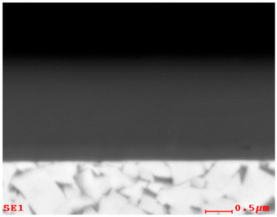 Observing Figure 2, it can be noticed that there was a zone with a lighter tone near the tool’s substrate material. This is the TiN layer deposited close to the substrate, with a view to improving its adhesion and facilitating the deposition of further layers. However, in Figure 2, this layer is not clearly perceptible, and its composition could not be assessed by direct EDS analysis due to the interaction of the surrounding elements with the ones in this thin layer. As such, elemental mapping of the coated samples was performed, determining that this layer was in fact, the TiN layer. The base image used for the element mapping can be observed in Figure 4, while the element mapping that was performed can be observed in Figure 5.
