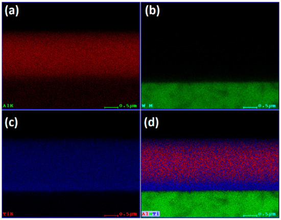 Element mapping performed on the tool coating: (a) Al distribution, (b) W distribution, (c) Ti distribution, and (d) Al, W, and Ti distribution overlapped.