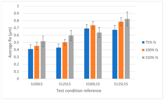 Apart from tool wear, it was noticed that machining parameters clearly influenced the machined surface’s quality, especially the feed per tooth (fz) parameter [45]. In Figure 6, the obtained results regarding the machined surface roughness for the various test parameters can be observed.