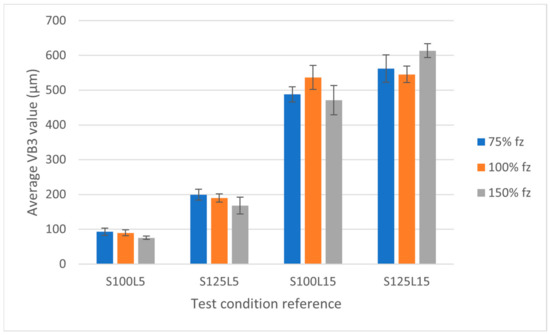 Comparison of flank wear (VB) values for all the test conditions (divided into three series regarding the selected fz parameter).