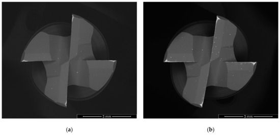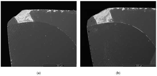 In Figure 8, two images obtained through SEM analysis of two tools’ top surfaces are displayed. In Figure 8a, a tool that was tested at 100 m/min with a 5 m cutting length and 0.07 mm/tooth (100% fz) is displayed. In Figure 8b, a tool that was tested at 125 m/min is shown (with the remaining machining parameters staying the same as those for the tool depicted in Figure 8a). In the case of Figure 8b, the wear is slightly more accentuated when compared with Figure 8a.
