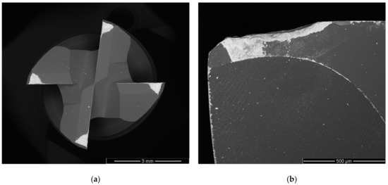 The employed tools are end-mills (INOVATOOLS, S.A., Leiria, Portugal) their substrate is a cemented carbide WC-Co, grade 6110. The substrate presents an average grain size of about 0.3 µm and uses 6% Co (percentual mass fraction) as a binder. Figure 1a depicts the tools’ shape.