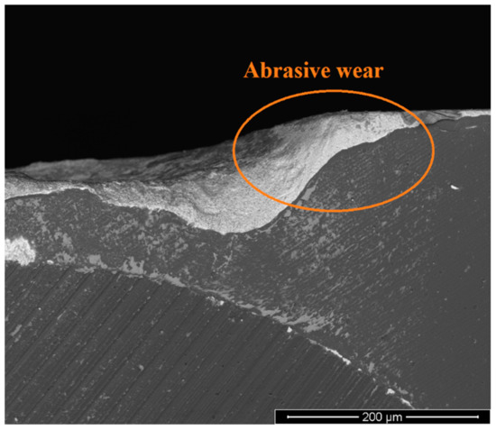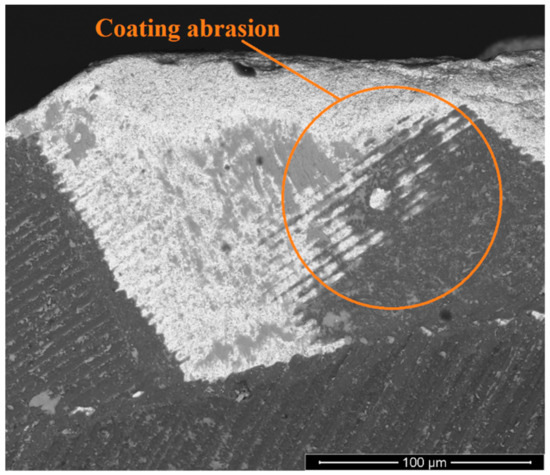 The tool coatings seemed to hold quite well. The TiN layer improved the coatings’ crack resistance and, as such, no major cracking was identified in the tested coated tools [17]. Furthermore, the coating’s adhesion was deemed to be quite good, as there was no major evidence of coating delamination, with the main coating wear mechanism being abrasion, as shown in Figure 14. As shown in Figure 11, the abrasion smoothed out and marked the tool’s surface. In this case, the coating was eroded due to the machined material being “dragged” across the tools’ surface.