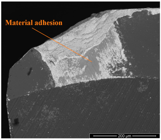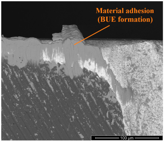 Initiation of the formation of a built-up edge (BUE) on a tool’s top surface, exhibiting material adhesion on the exposed substrate (shown on a tested S100F75L15 tool).