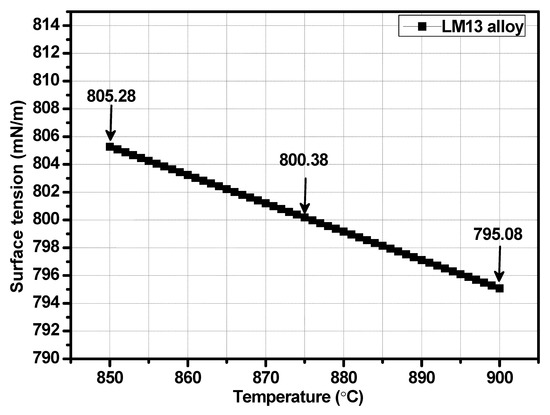 The initial viscosity ηL of the melted Al-Si12CuFe is A = 0.002732 and B = 16.6. The solid volume fraction φ, ηC is the viscosity of the composite. The higher viscosity of the melted Al-Si12CuFe alloy is attributed to the higher volume fraction of ceramic particles. However, the ceramic particles should not settle to the bottom of the mixer in the mold for uniform distribution [27]. Temperature is an essential factor in how much the solid and liquid phases lubricate each other, which in turn affects composite viscosity (Figure 6). Surface tension and viscosity, according to Pelofsky [28], have the following relationship: