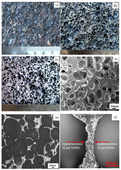 The images of aluminum foam composites with 2 wt.% blowing agent CaCO3 at (a) 850 °C, (b) 875 °C, (c) 900 °C, (d) SEM image; and optical images (e) and (f) of composites foam at 900 °C.