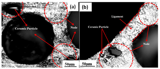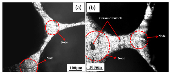 where m belongs to the mass of the foam sample in open air, mw is related to the mass in distilled water of the same foam sample, and ρw is the density of distilled water. The number of cells, size, thickness of cell wall, node size and ligament length were measured with the help of an ink pattern taken from the surface of the foams. The square-shaped foam samples (20 mm × 20 mm × 20 mm) were used to find the number of cells with the help of the ink pattern. The morphology of the metal foam and metal matrix composite foams were further investigated through optical and scanning electron microscope. The composite samples were mechanically polished and etched with Keller’s reagent for a metallographic study. Optical microstructural analysis was used to examine the prepared samples (Eclipse MA-100, Nikon, Tokyo, Japan). A Vickers hardness testing machine was used to determine the microhardness of the composite’s various phases (particles, particle/matrix interface, and matrix) (Mitutoyo, Kanagawa, Japan). Each set of samples was tested for microhardness by taking a minimum of five indentations at 100 gmf on each sample.