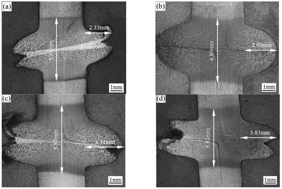 The residual height and HAZ width of the joint under different upset current. (a) 42°; (b) 44°; (c) 46°; (d) 48°.