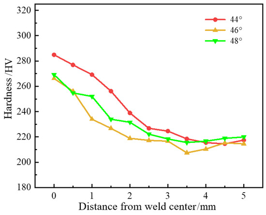 The fixed flash current is 48°. The hardness distribution of the joint is studied when the upset current is 44°, 46°, and 48°. The hardness distribution of the joint under different upsetting current is shown in Figure 3. Similar to the joint hardness distribution under different flash current, the joint hardness gradually decreases from weld to base metal under different upset current; When the upsetting current is 44°, the average hardness value of the joint area is the highest and the maximum hardness value occurs at the weld, which is 284.9 HV. According to the results of joint hardness distribution under different upsetting currents, the optimal value of the upsetting current was determined as 44°.