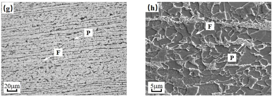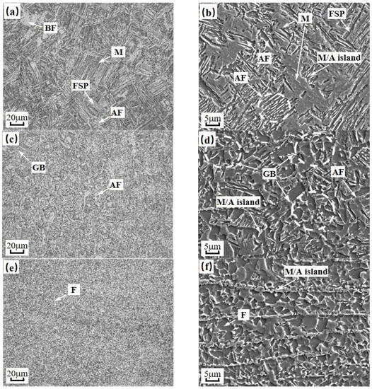 The microstructural constituent of WS (Figure 4a,b) can be observed to be composed of ferrite-side-plate (FSP), acicular ferrite (AF), and martensite (M). The microstructure contains more lath martensite and a small amount of coarse bainite ferrite (BF) grains. The distribution of martensite laths is fine and uniform. The microstructure of CGZ (Figure 4c,d) contains acicular ferrite (AF) and granular bainite (GB). GB has a high content and is evenly distributed, and AF is island distributed. The short rod and block M/A islands are distributed dispersedly. The microstructure of FGZ (Figure 4e,f) is comprised of fine grain ferrite and a certain amount of M/A islands. M/A islands are characterized by significant banded distribution. Banded structure can cause anisotropy of steel and make the plasticity and toughness of steel worse. Ferrite presents massive and discontinuous morphology characteristics. The microstructure of BM (Figure 4g,h) consists of equiaxed ferrite and pearlite and it has a banded distribution along the rolling direction.