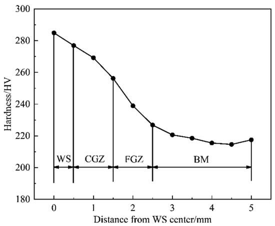 The hardness distribution of the welded joint is shown in Figure 5. Compared with BM, the hardness of WS and HAZ was increased to a certain extent, and the increase in WS was most obvious. The average hardness values of WS, CGZ, FGZ, and BM were 280.9, 262.7, 232.9, and 217.3 HV, respectively. In terms of the hardness distribution of the welded joint, there is no softening tendency in the welded joint.
