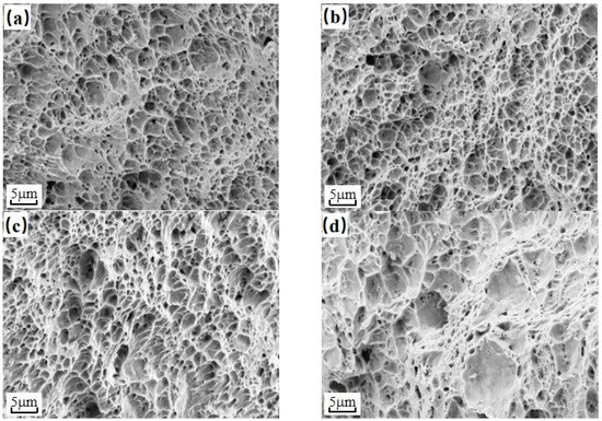 The standard impact energy value at −40 °C of WS, CGZ, FGZ, and BM was 116, 128, 144, and 88 J, respectively. Figure 6 shows the fracture morphology of different regions of the welded joint. The fracture mode of each region was ductile fracture. The dimples in BM were relatively large and shallow, somewhat smaller and deeper in WS and CGZ, and the dimples in FGZ are the deepest compared with the other three regions. Isoaxial dimples were distributed in the impact fracture morphology of different regions of the joint, and no fluvial cleavage fracture feature was found. Therefore, it can be determined that the fracture mode in each region belongs to ductile fracture. Cavities or coarse particles (Figure 6d) fully expand and polymerize under tensile and shear stresses, resulting in fracture, presenting equiaxed dimples of relatively uniform size. The final separation occurs along the direction of the maximum shear force, resulting in an overall shear fracture.