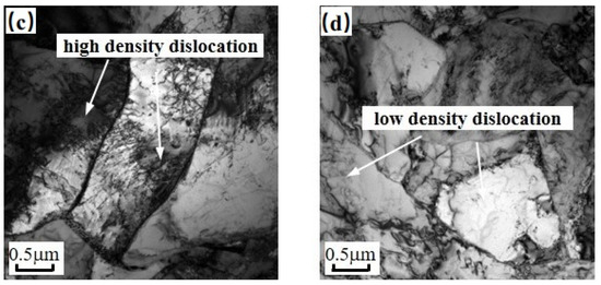 The hardness of WS was the highest because of the existence of M and BF (Figure 8a) and the hardness of CGZ was only inferior to WS with microstructure of AF and GB (Figure 8b). The main microstructure of FGZ and BM was F, so the hardness is lower. As shown in Figure 8c,d, there are higher dislocation density and smaller grain size of ferrite in FGZ compared with BM, making it macroscopically manifest as high strength and hardness because of more grain boundaries in unit area, greater hindrance to dislocation movement and greater resistance to material deformation. Therefore, the hardness of FGZ is greater than BM. Since the hardness of BM is the lowest, the welded joint is more likely to undergo plastic deformation at BM during stretching, which eventually leads to fracture.