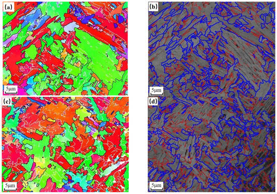 Figure 11 shows the crack propagation path of acicular ferrite. The grain boundary of ferrite laths in same cluster is small angle grain boundary, while adjacent laths show different orientations. Large angle grain boundaries between adjacent laths become obstacles to crack propagation, which increases the impact energy [23,24]. FSP is the product of high temperature stage of solid phase transition in WS and the M in WS belong to brittle hard phase, which may cause the deterioration of impact toughness. Therefore, the toughness of CGZ is better than WS in terms of the microstructure and grain orientation.