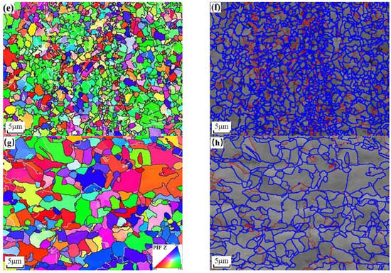 Figure 9 shows EBSD analysis results of each region of the welded joint. In EBSD analysis, the orientation difference of 0°–15° is defined as small angle grain boundary (shown in red line), which contains inclined grain boundaries and torsional grain boundaries, and the orientation difference is 15°–180° is defined as large angle grain boundary (shown in blue line). The small angle grain boundary energy is the energy of the dislocation group, while the large angle grain boundary energy is dominated by the core energy, and the energy value is between 0.15~1.2 J/m2, which is independent of the orientation difference and is basically a constant value.