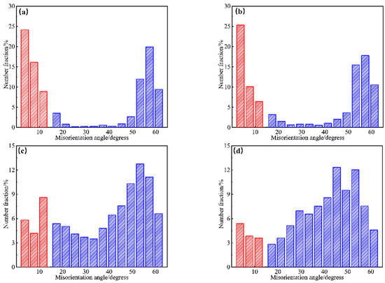 Results of small and large angle grain boundaries proportion. (a) WS; (b) CGZ; (c) FGZ; (d) BM.