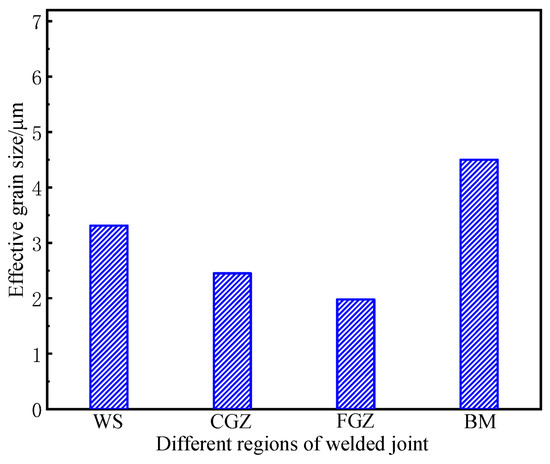 where E is elasticity modulus, ac is critical crack size, W is the deflection plastic work on the lath, H is the lath bundle width, and d is the lath width. According to Equation (1), the crack propagation resistance is inversely proportional to the effective grain size H−1/2, which is equivalent to toughness. Figure 12 shows the effective grain size of each region of the joint according to EBSD analysis results. The effective grain size of WS, CGZ, FGZ and BM is 3.31, 2.45, 1.98, and 4.5 μm, respectively. The effect of effective grain size on toughness can be summarized in two aspects: (1) the smaller the grain size, the larger the area of grain boundaries hindering the crack propagation, and the smaller the dislocation pile-up group in grain boundaries, which reduces the stress concentration. (2) The smaller the grain size, the higher the density of grain boundaries, and the lower the polymerization concentration of impurity elements on the boundary, which avoids the brittle fracture along grains. Therefore, low temperature impact toughness can be effectively improved by reducing effective grain size.