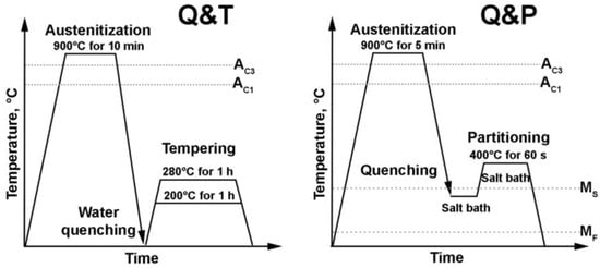 The microstructural design of Q&P steels consists of the combination of carbon-depleted martensite with carbon-enriched retained austenite (RA) [,,,]. Q&P processing is a complex heat treatment consisting of at least four steps [,,,,,]. The first step involves full austenitization followed by rapid cooling in a salt bath to a quenching temperature, Tq, lying between the martensite-start (Ms) and martensite- finish (Mf) temperatures (Figure 1) [,,,,,,,,,,]. The second step is quenching in a heated salt bath, which produces primary martensite and a considerable amount of RA. The carbon partitioning from martensite to austenite to enrich RA with carbon occurs during isothermal annealing at a temperature, Tp, that is usually above the Tq and Ms temperatures. This third step of Q&P processing is termed as “partitioning” [,,,]. The final fourth step is air cooling or water quenching from Tp to ambient temperature that leads to the partial transformation of RA into secondary martensite distinguished by morphology, higher dislocation density, and carbon content from primary martensite []. In addition, transition carbides are rarely observed in secondary martensite compared to primary martensite []. Typically, the temperature of partitioning, Tp, is higher than Ms, but there are Q&P routes in which Tp lies below Ms or even Ms = Tp [,,,,,].