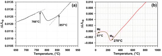 The Ac3 and Ac1 critical temperatures were calculated by means of the Thermo-Calc software (Ver. 5, Thermo-Calc Software, Stockholm, Sweden) using the TCFE7 database. The dilatometry curve obtained during cooling from 900 °C to room temperature at a cooling rate of 100 °C/s using a DIL 805 dilatometer (TA Instruments Inc., New Castle, DE, USA) was used to determine the MS and MF temperatures on cylindrical samples with a 10 mm length and a 3 mm diameter.