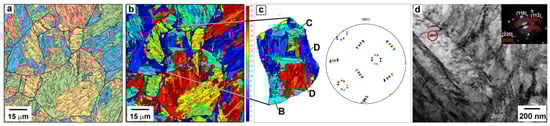 The typical microstructure after water quenching is presented in Figure 3a–c. Relatively coarse PAGs with an average size of ~28 μm could be distinguished (Figure 3a,b). At the same time, the average distance between HABs of 1.3 μm is small. This is attributed to the fact that packets which are aggregations of the blocks with the same {111}γ plane [] and strongly distinguished by dimension and shape [] evolve within a PAG (Figure 3c). First-order packets (indicated as B and C in Figure 3c) with dimensions ≥ 10 μm and an irregular shape contain a number of blocks (>3) and are located at the boundaries of PAGs. Second-order packets with an elongated shape and an average longitudinal dimension of ~10 μm and an average transverse direction of ~3 μm (D in Figure 3c) are located on the boundaries of first-order packets or PAGs. Third-order packets consisting of one block usually appear within the matrix of first-order packets (Figure 3b,c). The other distinct feature of the lath martensite structure evolving in the present steel is a high dislocation density of 5.4 × 1014 m−2. The volume fraction of RA is negligible (~0.7).