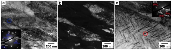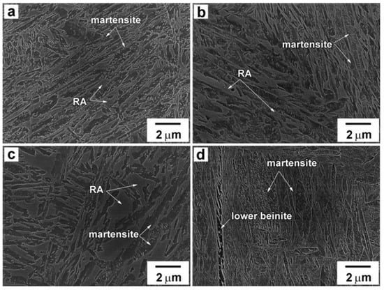 The second constituent is islands of secondary martensite/RA with an irregular shape (Figure 4a–c) [,,,,,]. These islands are gray regions of a featureless surface [,] and are distinctly distinguished from primary martensite by less etching and color [,,]. TEM observations (Figure 7) revealed that the density of free lattice dislocations ρTEM~2 × 1015 m−2 in RA and secondary martensite is essentially the same (Table 2). It is worth noting that the very high dislocation density observed in RA by TEM and EBSD studies is in contrast with the earlier presumption [] and could be attributed to intense plastic straining of this phase during γ→α′ transformation. In SEM micrographs (Figure 4), the secondary martensite could not be distinguished from RA by etching, which is indicative of the same carbon content in these two structural components. The secondary martensite/RA islands, characterized by high AR, are located between the plates of primary martensite. The volume fraction of this structural component increases with increasing Tq.
